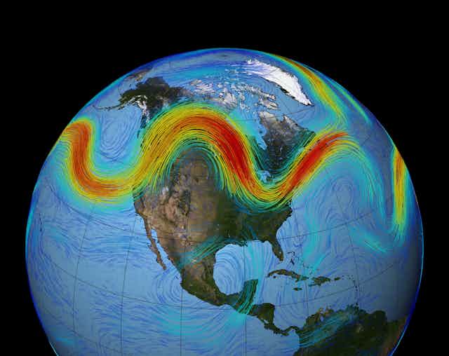 First, it disturbed the atmosphere in just the right way to set off an undulation in the jet stream - a river of very strong winds in the upper atmosphere - that atmospheric scientists call a Rossby wave (or a planetary wave). Then the wave was guided eastwards by the jet stream towards North America.
