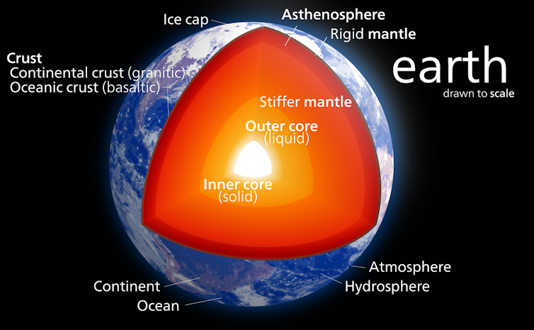 The main known sources of radioactivity within the Earth are unstable types of uranium, thorium and potassium – something we know based on samples of rock up to 200km below the surface. What lurks beneath that depth is uncertain. We know that the geo-neutrinos emitted when uranium decays have more energy than those emitted when potassium splits up. So by measuring the energy of geo-neutrinos, we can know what type of radioactive material they come from. In fact, this is a much easier way to figure out what’s inside the Earth than drilling tens of kilometres down below the surface.