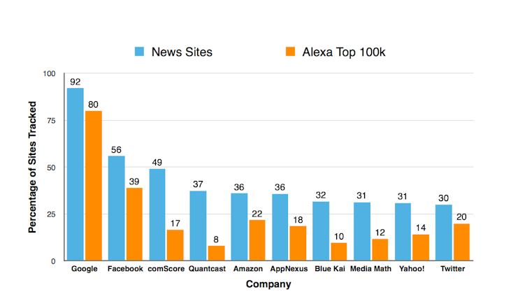 Much of this tracking is performed by well-known companies who wield significant presence and power. For example, Google and Facebook have code on 92% and 56%, respectively, of the 2,000-plus news-related sites that we analyzed.