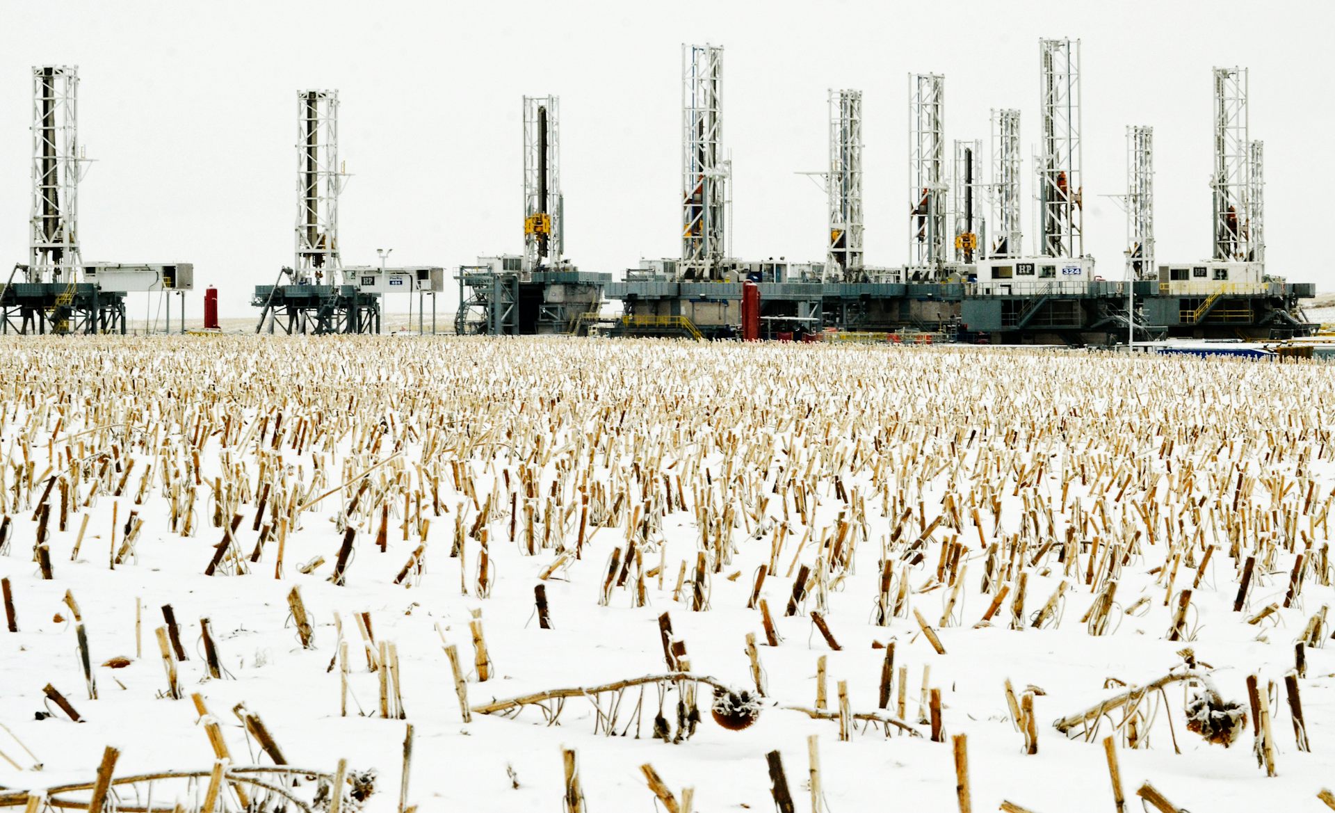 Dormant: oil rigs in North Dakota stand idle due to a crash in global oil prices.