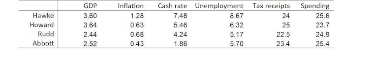 Inflation and the Reserve Bank’s cash rate were higher under Hawke/Keating (HK), but that was a time of globally high inflation and interest rates. The “recession we had to have” in the early 1990s brought the inflation rate down, and also explains the high unemployment rate average under HK.