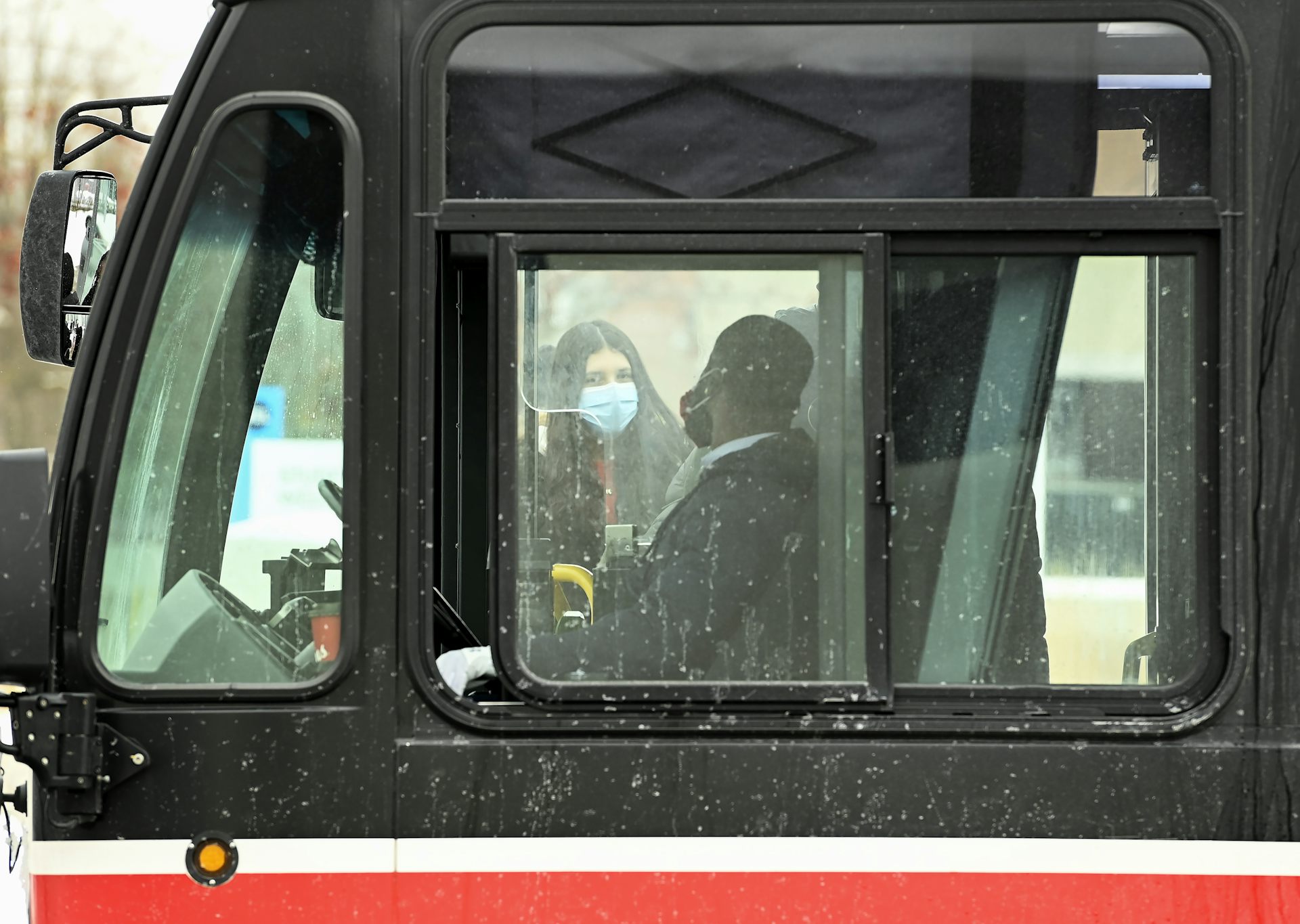 People wearing protective masks board a city transit bus during the COVID-19 pandemic in Toronto on Feb. 19, 2021.
