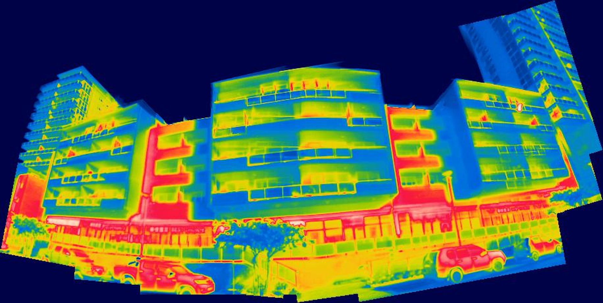 Some materials and surfaces radiate much more heat (red areas) than others, as can be seen in this thermal image of Arncliffe Street in Wolli Creek, Sydney.