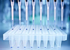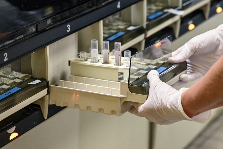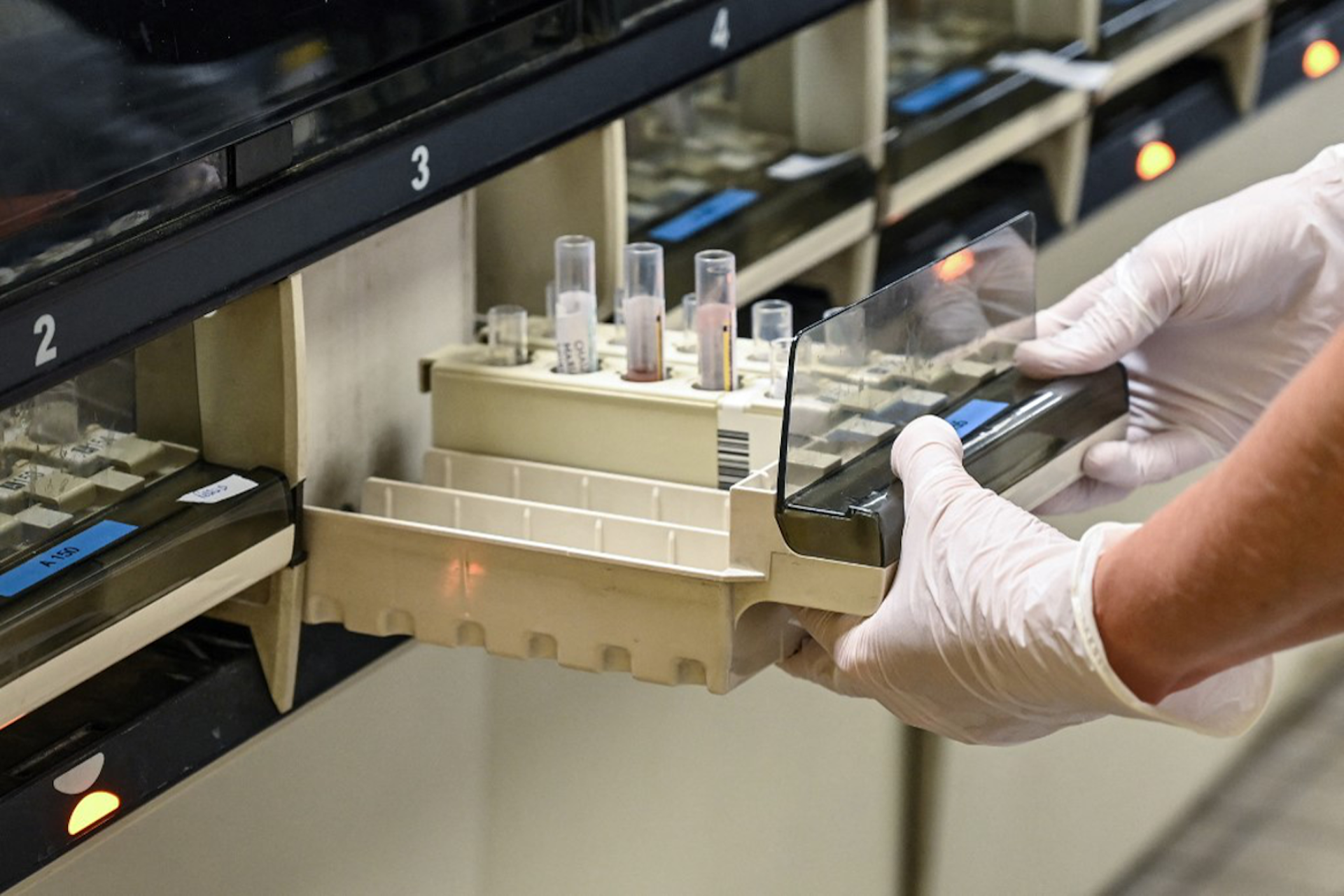 Changement de pièce. Les tubes sont insérés par séries de 93 dans un robot-pipeteur, qui transfert les échantillons sur une plaque de test percée de 96 micro-puits. Les trois puits vides reçoivent des échantillons de contrôle permettant le suivi de l’ensemble du processus d’analyse.