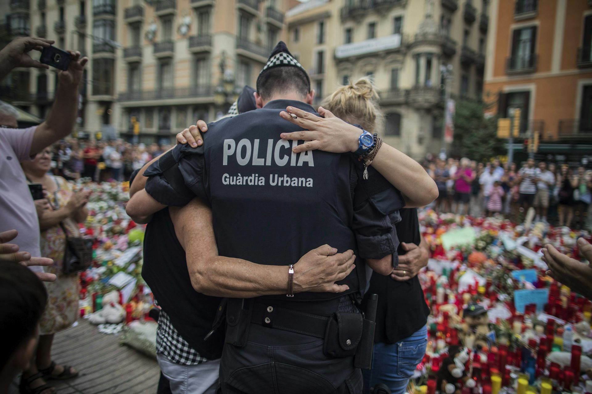 At a memorial honouring the victims of the recent Spanish terrorist attacks, a family embraces a Barcelona policeman who helped them during the mayhem.