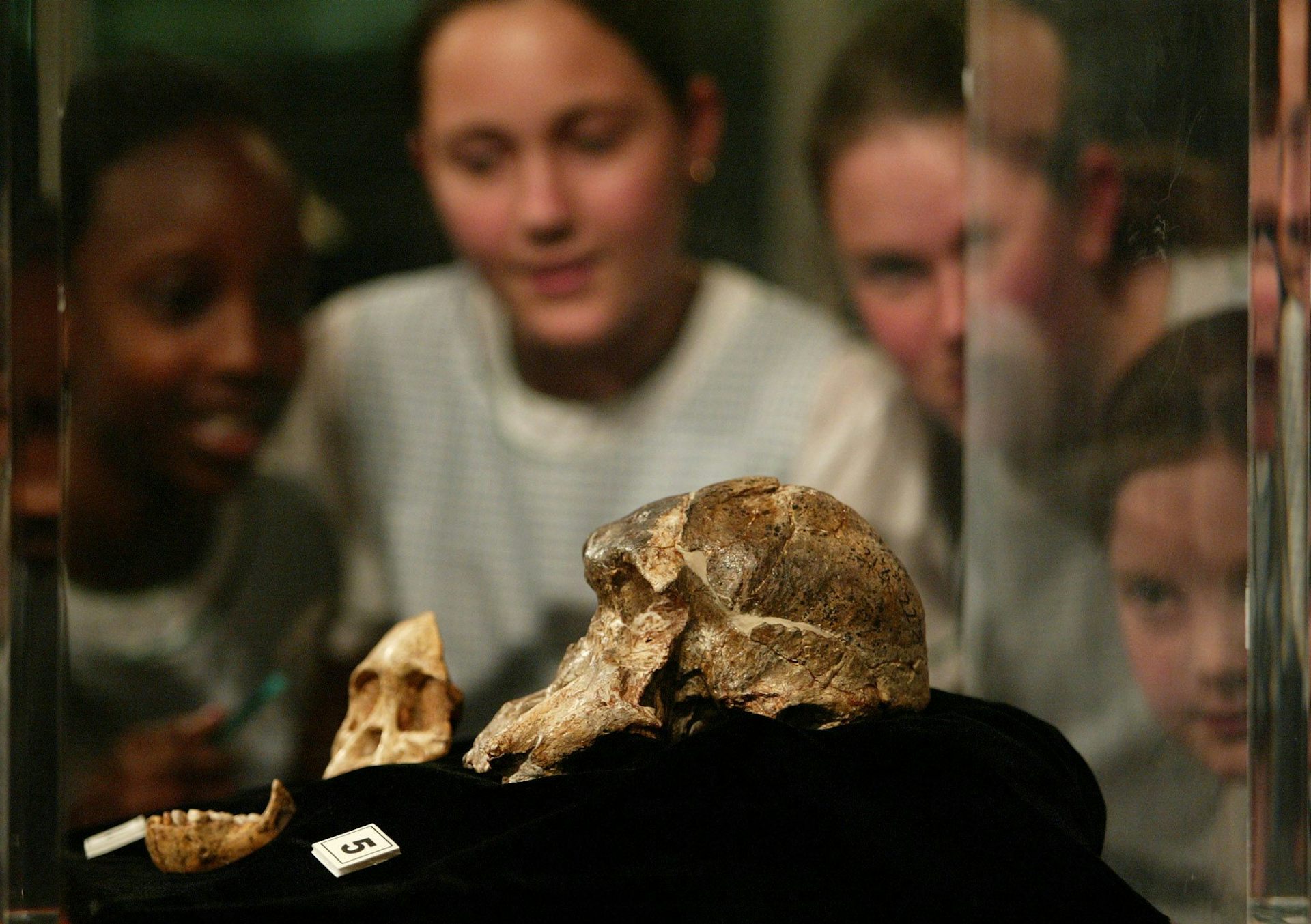 Children gather around a fossil skull at a South African museum.