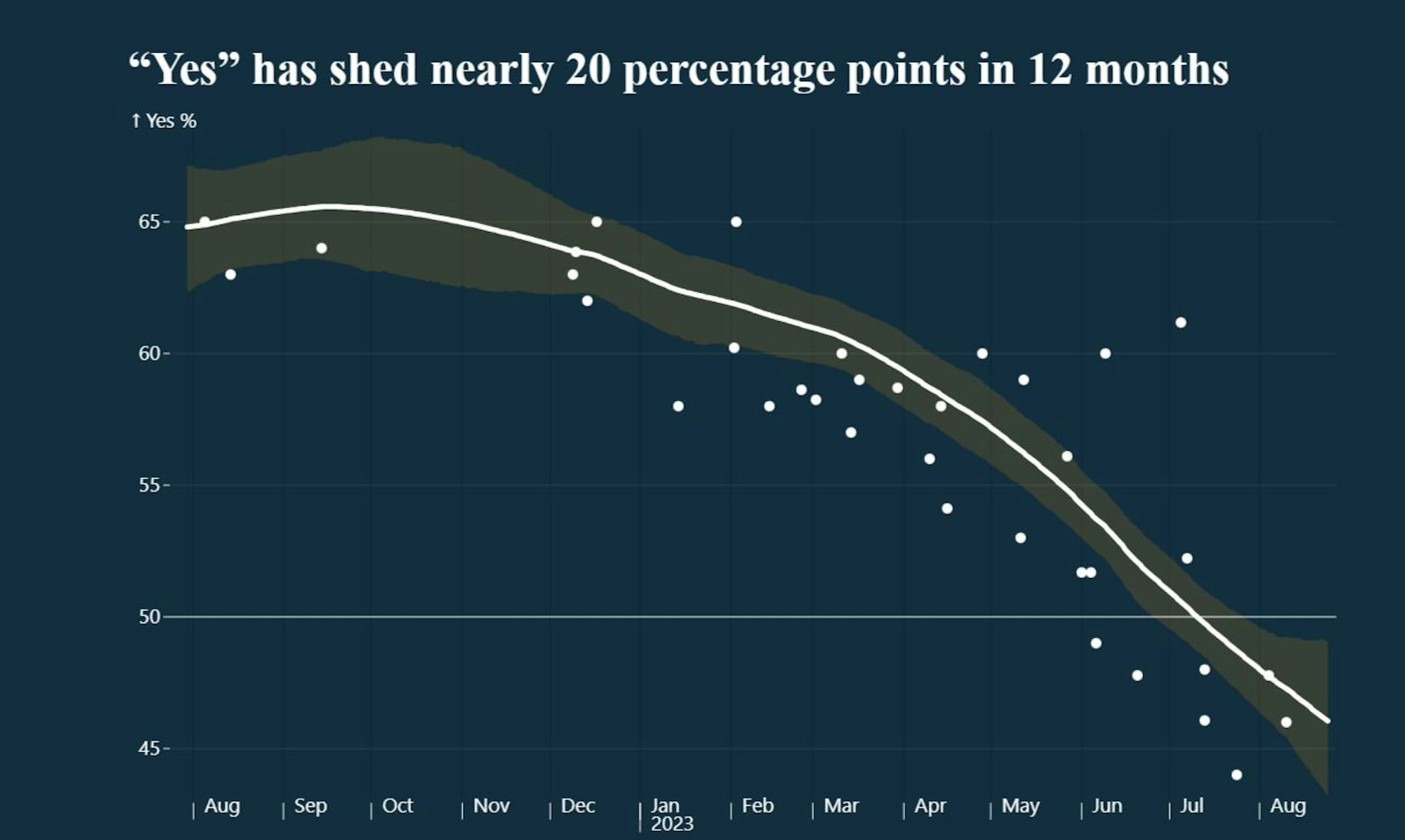 Finally, if we look at how the polls are tracking by pooling together the major polling companies’ data, Professor Simon Jackman finds a loss of 20% in voter support for the “yes” campaign over the past 12 months.