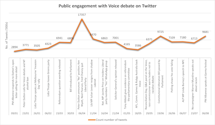 An analysis of X (formerly Twitter) data shows key events attracting the most public attention this year were Opposition Leader Peter Dutton’s decision not to support the Voice to Parliament, and the subsequent party resignations of Liberals Ken Wyatt, Noel Pearson and Fred Chaney on April 6.