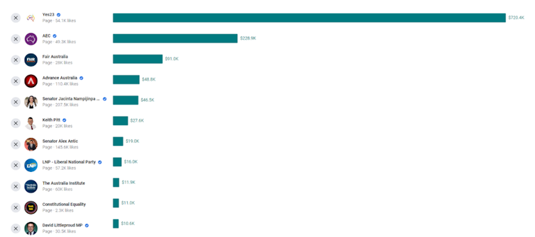 However, Yes23’s core messages are more disparate than the “no” ads paid for by Advance Australia for the “Fair Australia” campaign. The “no” ad spend focuses on its stronghold states in Queensland ($33,652) and Western Australia ($27,234), and the possible flip-state South Australia ($16,6712).