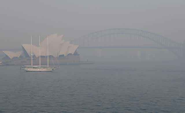 Sydney and its suburbs have been enveloped in haze over the past few days. The haze is a mixture of bushfire smoke and dust blown in from western New South Wales. As particles move from rural locations, like Gospers Mountain in this case, they make grey cities.