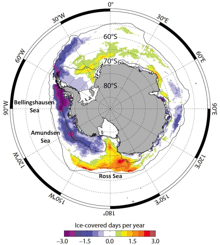Perhaps the most important fact about the (slight) increase in total Antarctic sea ice extent is that it masks major and contrasting regional changes. For example, there has been a strong decrease in sea ice duration in the Bellingshausen Sea, while the duration has increased in the western Ross Sea. Such curiosities have led sea ice scientists to investigate several possible mechanisms, and explanations for these patterns are now starting to emerge.