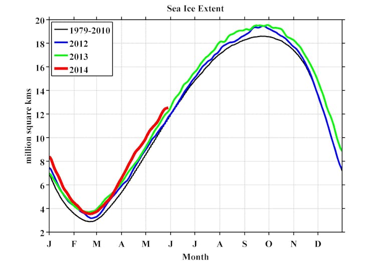 However at the other end of the planet, the Antarctic canary seems to be singing away happily, as the total extent has grown, albeit weakly, over the same period. The past two years have each been record-breakers, and 2014 looks to be building the same way. You can track how it’s going here, which shows how much more sea ice there is relative to the 1981-2010 average.