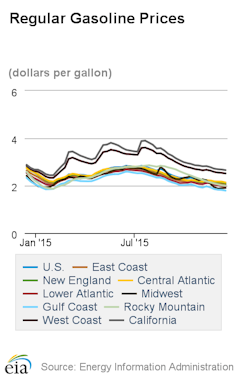 American consumers have been enjoying Christmas since July – that is, July 2014, when the average price for all grades of gasoline peaked at US$3.75 per gallon, according to the Energy Information Administration. Since then, prices have declined substantially, as every motorist knows: to $2.90 by Thanksgiving 2014 and to $2.14 as we approach the end of 2015. In many parts of the country, the price of regular gasoline is well below $2 per gallon today.