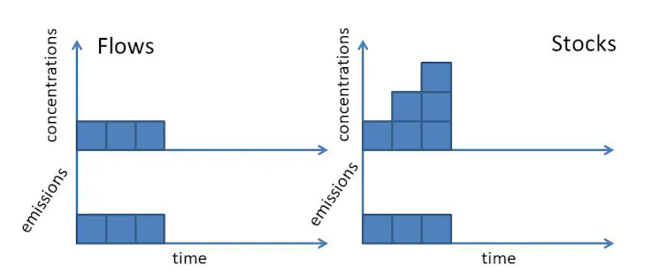 The difference between stock and flow pollutants is shown in the figure below. Flow pollutant emissions, for example of methane, do not persist. Emissions in period one, and the same emissions in period two, lead to a constant (or roughly constant) amount of the pollutant in the atmosphere (or river, lake, or sea).